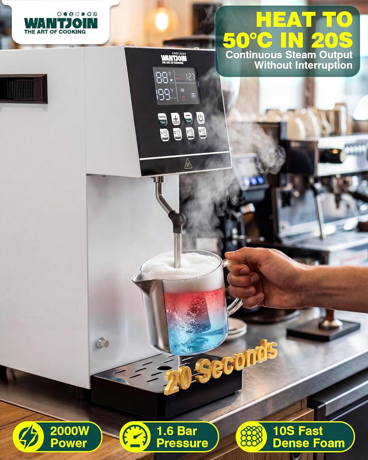 WantJoin Commercial Milk Frother – 2000W Milk Steamer for Latte Cappuccino Coffee, Beverage Heater with Hot Water Dispenser & LED Display, Hotel Use (White)
